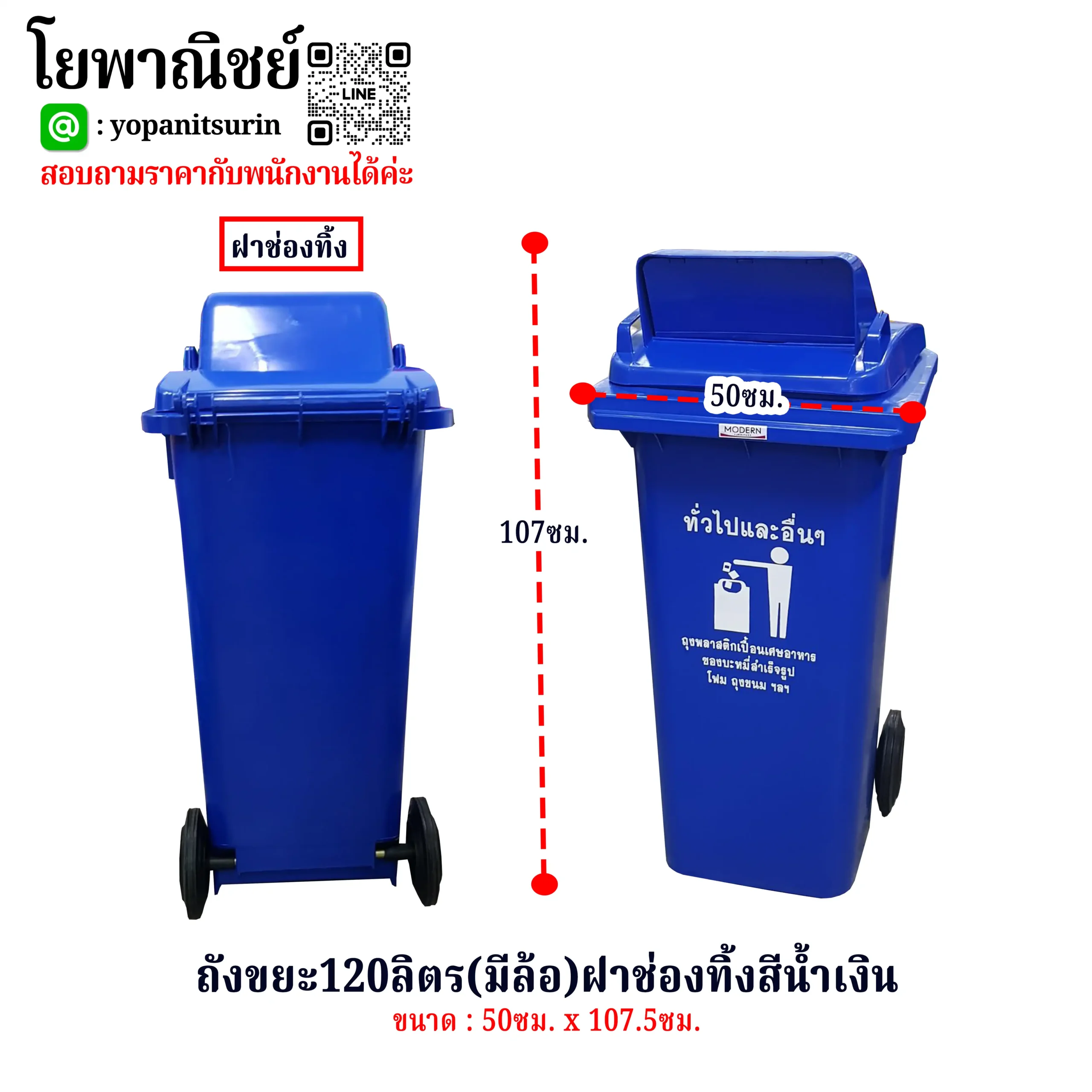 ถังขยะ120ลิตร(มีล้อ)สีน้ำเงินฝามีช่องทิ้ง